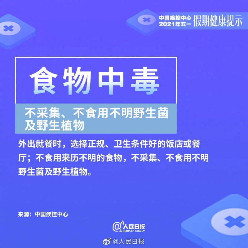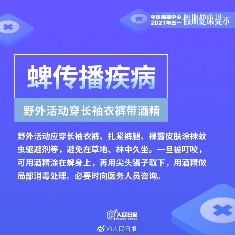 “五一”假期臨近,中國(guó)疾病預(yù)防控制中心通過(guò)官方微信公眾號(hào)發(fā)布健康提示,建議重點(diǎn)做好新冠肺炎、諾如病毒腸炎、手足口病、蜱傳播疾病、動(dòng)物傳播疾病和食物中毒的預(yù)防與防范。