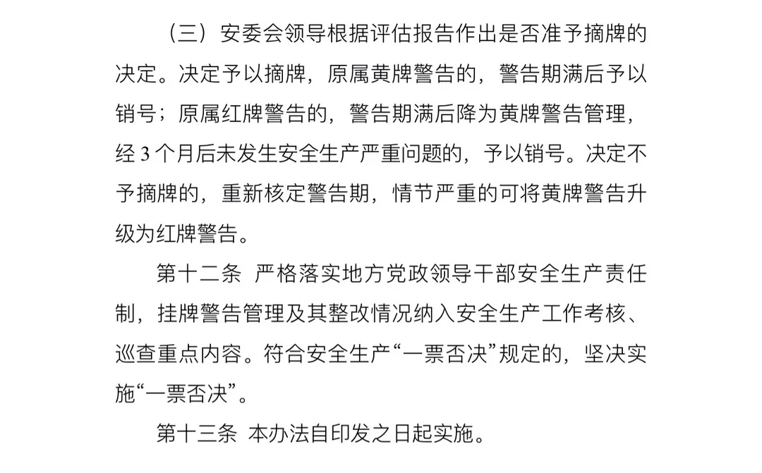 一是與黨政領導干部責任制相銜接。根據(jù)黨政領導干部安全生產責任制規(guī)定,本辦法對掛牌警告與安全生產巡查、考核和安全生產“一票否決”等制度作了協(xié)調性規(guī)定。
